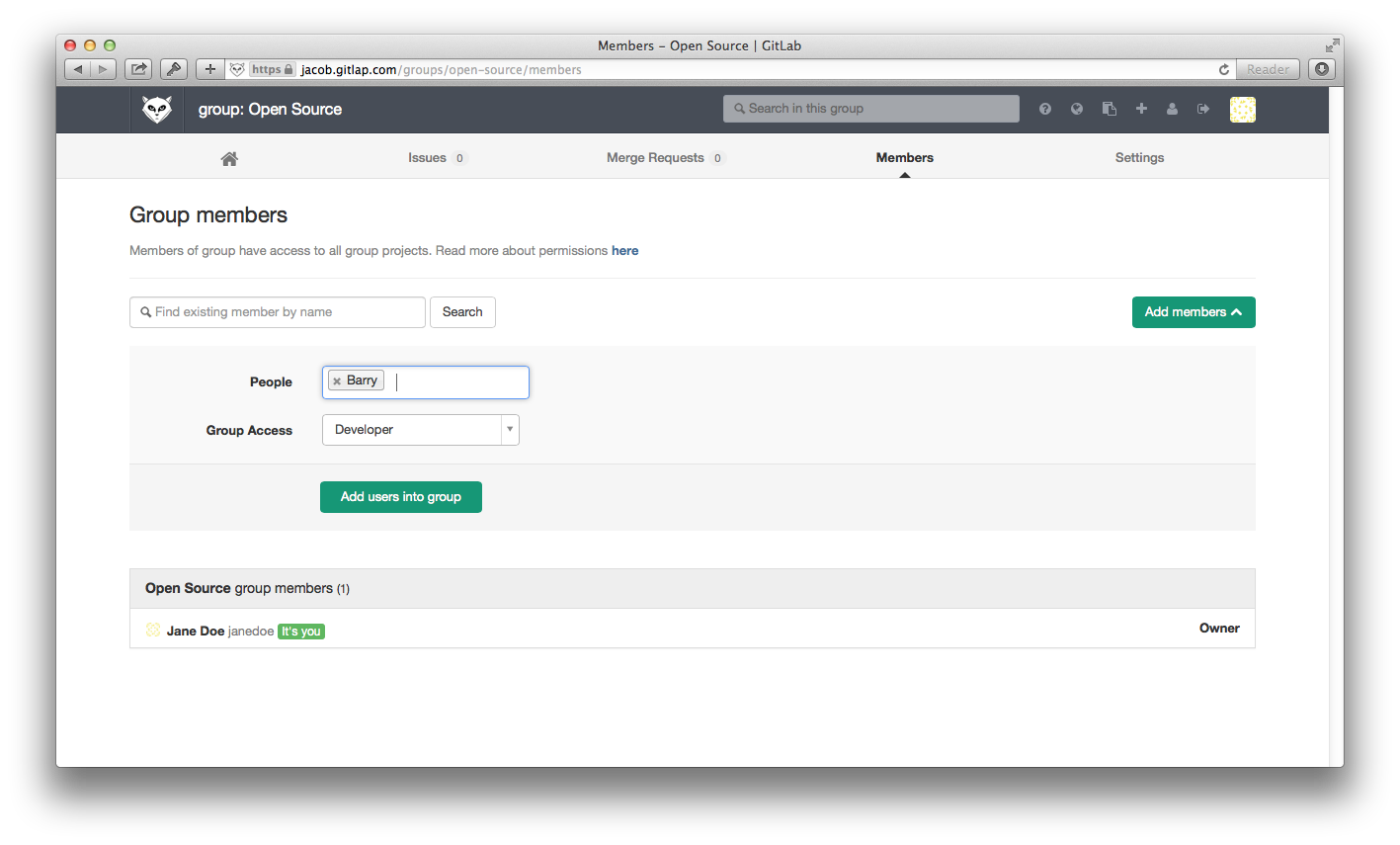 Now because Barry is a 'Developer' member of the 'Open Source' group, he automatically gets 'Developer' access to all projects in the 'Open Source' group.